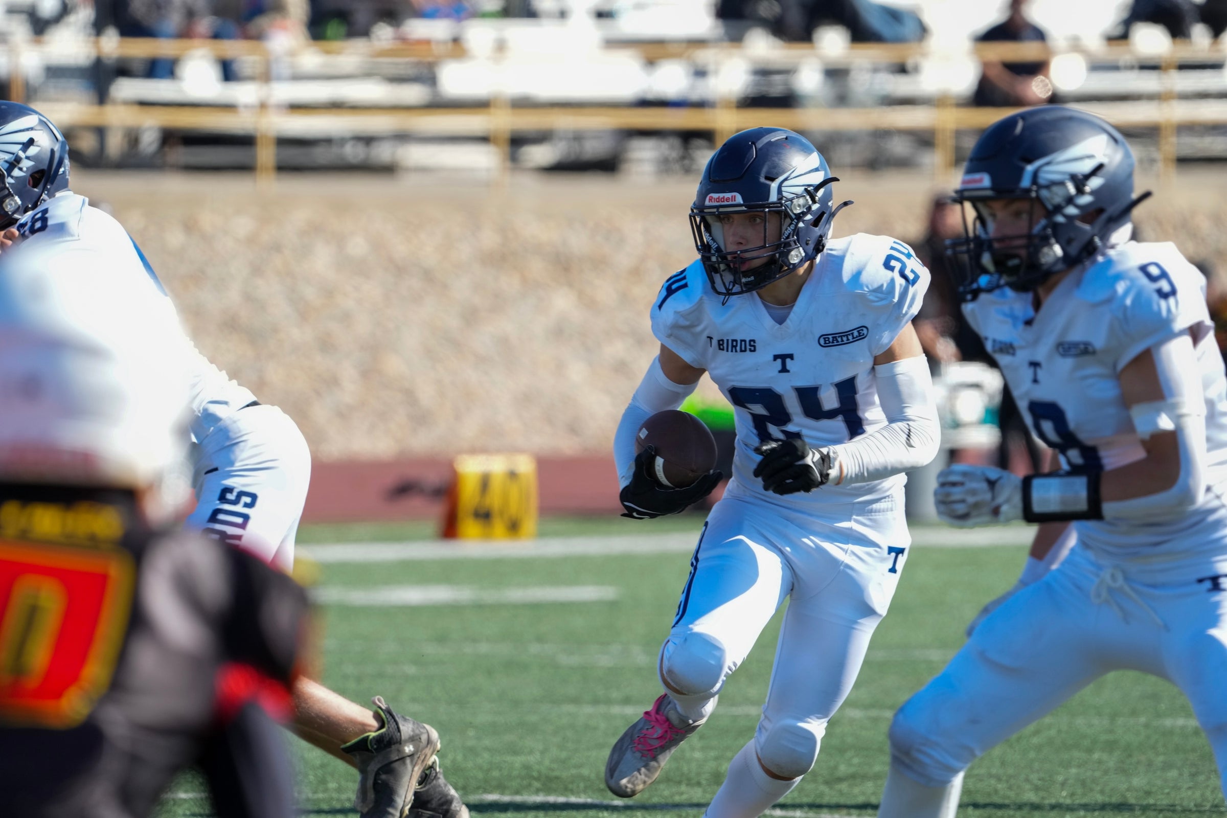 The Jamboree is a rapid-fire scrimmage over two hours. Premier and Champion teams will have separate Jamborees. Each T-Birds team will play three 20-minute mini-games. Each side gets 8 minutes of running clock offense, a 4-minute break, and 8 minutes of running clock defense. There are no timeouts and no Special Teams (punts, kickoffs, returns) at the Jamboree.