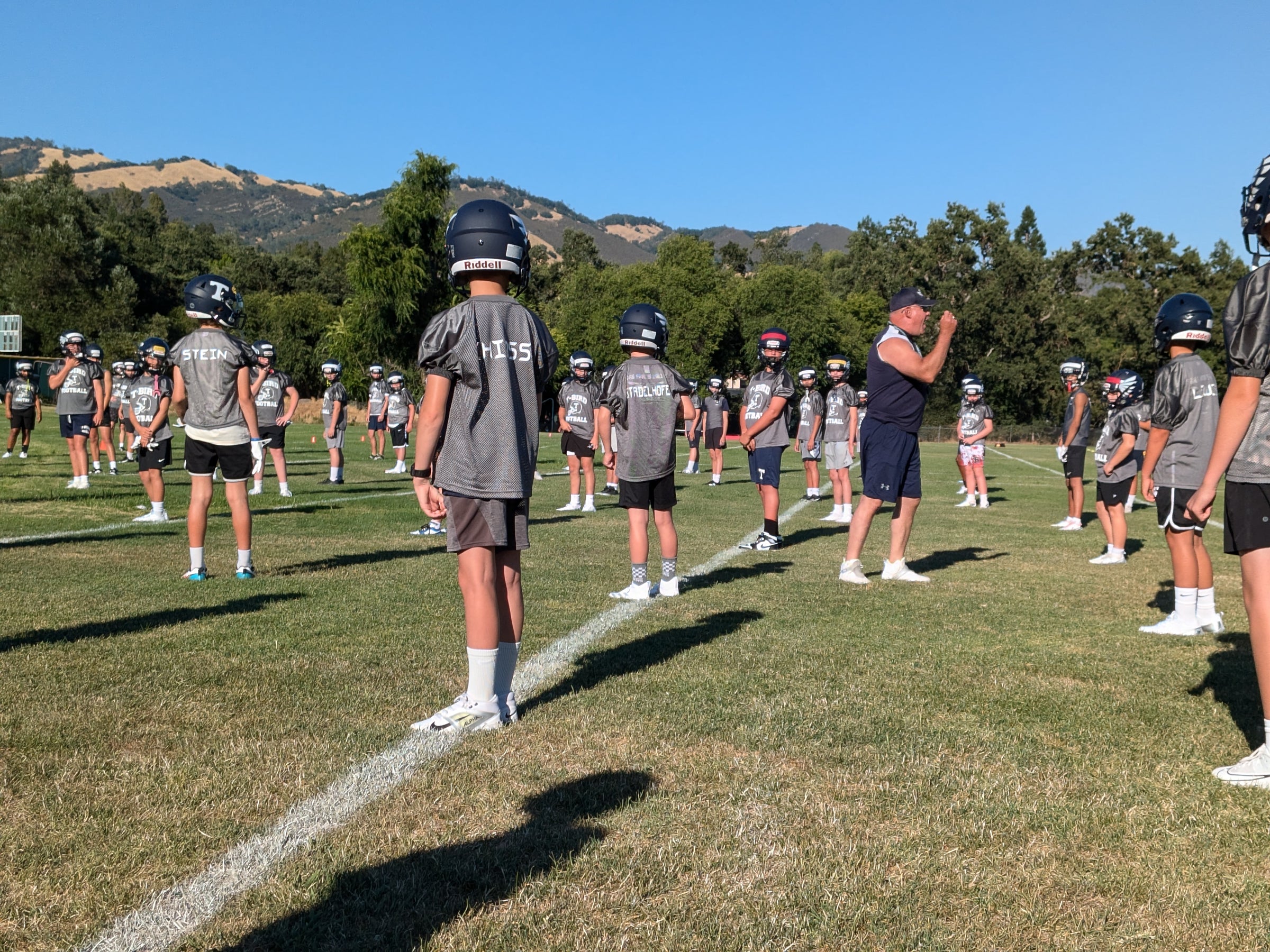 The first week of practice can be busy. There are typically several hundred kids combined across J-PW, PW, JV, and Varsity. Helmets sometimes don’t fit, kids forget items. The most commonly lost items are mouthpieces. The Equipment shed has a ton of these. All blocking pads & equipment are stored in the T-Birds Equipment shed on the Monte Vista Practice field. The teams are split between the Monte Vista Practice field and the Los Cerros Middle School fields. Each level (e.g., PW) has a dedicated practice field. Bigger teams like JV may occupy several practice fields. As a coach, it is our responsibility to retrieve and return equipment to the shed each day. T-Bird teams spend the first half of practices focused on ~4-6 position stations, rotating between offense skill and defense skill days.