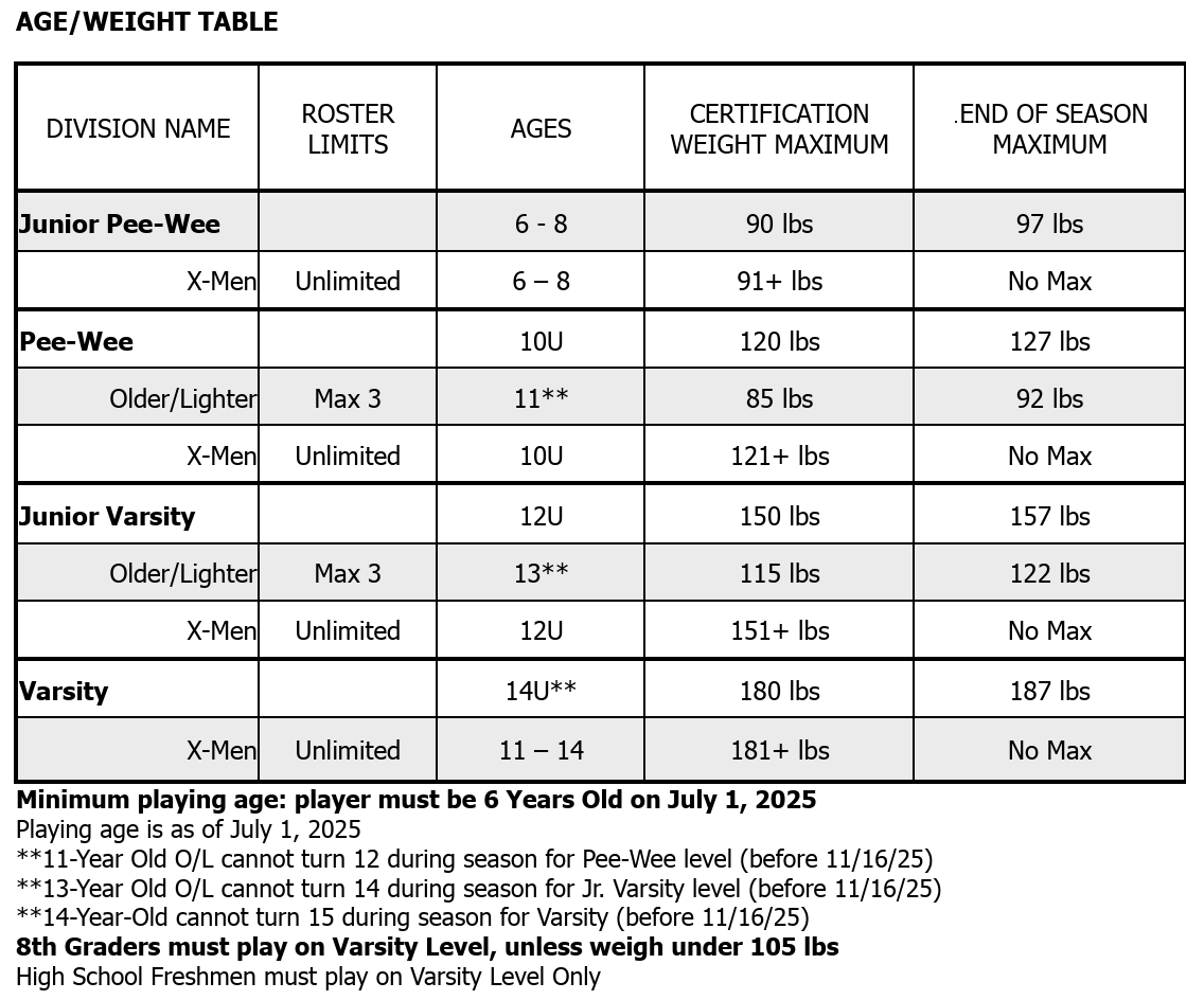 - Older/Lighter: Older/Lighter players are players who are a league age year older than regular players. They are allowed to play down a division if their weight falls within the weight limit of the Age/Weight Table in the EBYFC Rule Book. Older/Lighter players are NOT allowed to advance in age during the season.